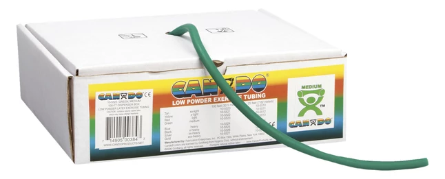 CanDo high quality latex resistive exercise tubing has been used in clinics for rehabilitation, conditioning and training since 1987. It has become a staple of many physical therapy and athletic training programs. CanDo exercise tubing is an economic solution for upper and lower body exercise. Effective when used alone, or with handles and anchors. CanDo is licensed to use the Thera-Band color sequence so resistance level is easily identified. CanDo low powder exercise tubing is made of natural rubber latex, which may cause allergic reactions. For those with latex sensitivities, there are latex-free alternative offerings of CanDo exercise tubing.