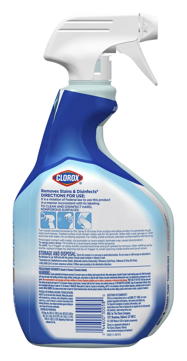 All-purpose bleach spray cleaner quickly and effectively cleans, disinfects and deodorizes a variety of surfaces both indoors and outdoors. Disinfecting formula removes tough kitchen and bath stains, grease and dirt on contact while killing more than 99 percent of germs. Smart Tube technology allows you to spray every last drop to prevent wasteful use. Easy-to-use trigger allows you to spray into corners and hard-to-reach locations for more efficient cleanings. Spray cleaner is perfect for cleaning hard, nonporous surfaces including kitchen sinks, counters, refrigerators, appliances, tubs, toilets and more.