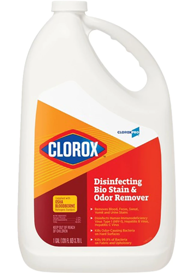 Disinfecting bio stain and odor remover features a combination of hydrogen peroxide, surfactant and low pH to disinfect and remove the toughest odors and stains in one step. Bleach-free formula uses hydrogen peroxide technology to kill norovirus, E. coli, Salmonella and Hepatitis C that may be found in human and animal bio soils. Stain-removing ingredients can be used to remove stains from blood, feces, vomit and urine. Broad surface compatibility allows it to be safe for use on common surfaces in your facility including upholstery, carpet, tile, grout, toilets and more.