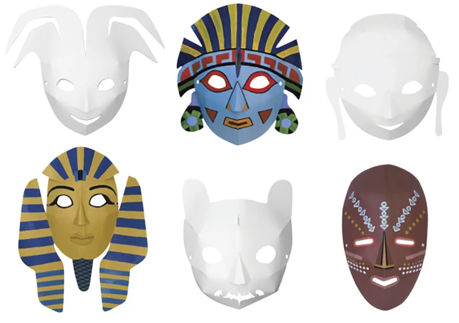 Fold up and tape for easy-to-make 3-dimensional masks. Decorate with markers, foam, paint and more.