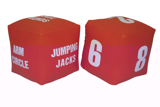 Sportime Fitness Dice measuring 4 x 4 inches is a vinyl covered dice that makes exercising more fun. Students roll the dice for fitness fun. Fitness dice is sold as a pair, one die with numbers and the other die with different exercises. One die has fitness and exercise directions (toe touch, arm circles, jumping jacks, pushups, knee bends, and leg lifts). The other has large screen-printed numbers (2, 4, 6, 8, 10, and 12) for repetition count.