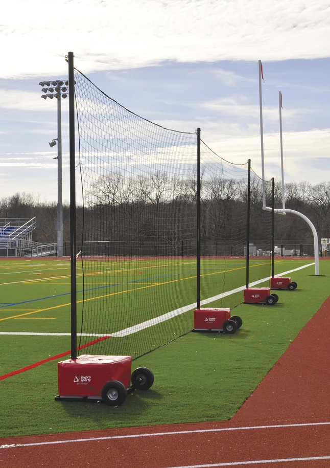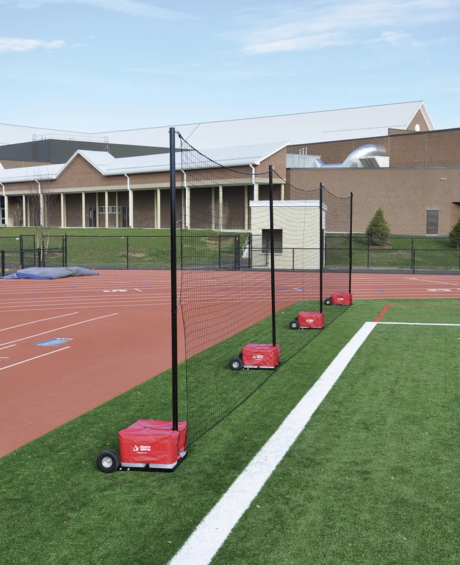 The Portable Field Pro Net System is a perfect way to separate two activities on the same field or close to each other. Package included 4 black powder coated poles, 4 bases (each with a 5 gallon jug), 1-3/4 inch knotted nylon netting and 4 red vinyl base covers. The 60 feet of netting provides enough length and is 12 feet in height to ensure safety on each side of netting.