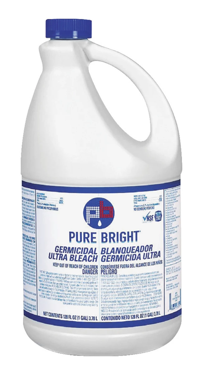 Germicidal bleach is specifically formulated for the tough cleaning needs of institutions and industrial cleaning settings, including clinics, hospitals, fitness clubs and restaurants. Pure Bright Germicidal Ultra Bleach contains no phosphates and is EPA-registered and NSF-approved with 27 CDC-approved germ kill claims. Use the bleach to provide a safe and germ-free environment in the kitchen, bathroom and work areas. General cleaning dilution ratio is 6 ounces to one gallon of water.