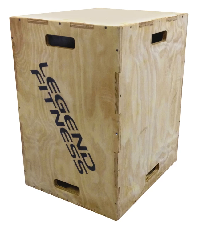 The Legend Fitness Wood Plyo Box 3-in-1 is a simple yet robust, economical option for plyometric training. Precision-cut plywood joined together using box joint construction and screws. Sanded edges make the thought of missed jumps a little less intimidating. Porthole handles make it easier to move around and rotate as needed. Rectangle shape offers three jump heights: 20, 24, and 30 inches. Ships fully assembled. .