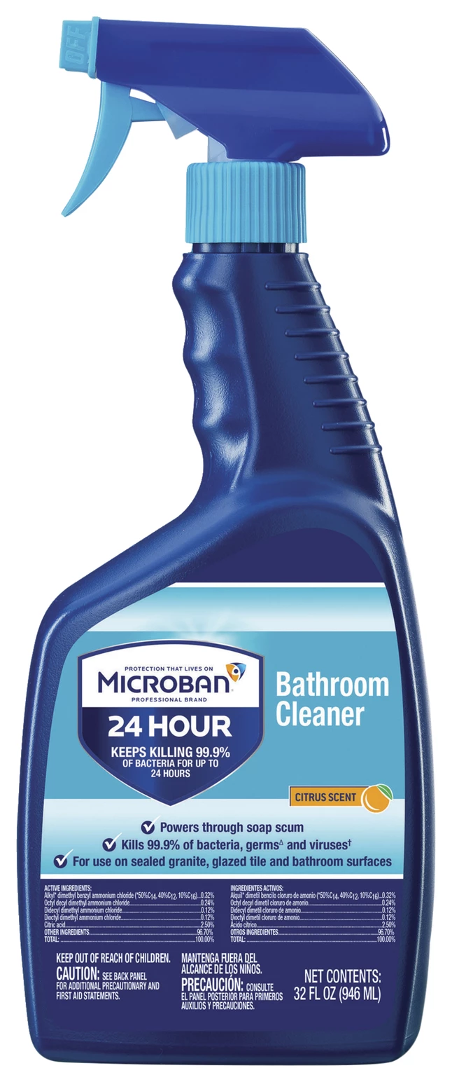 Bathroom cleaner features Microban antimicrobial technology to sanitize surfaces in 10 seconds and keep killing 99.9 percent of bacteria for up to 24 hours, even after multiple touches. Its versatile design powers through bathroom soils in sinks, faucets and floor areas. Phosphate-free formula prevents mold and mildew growth for up to seven days. Bathroom with a citrus scent cleaner is perfect for sealed granite, glazed tile and bathroom surfaces