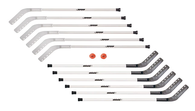 Shield Outdoor Middle School Floor Hockey Complete Set is ideal for grades 5 through 12. Sticks measuring 42 inches, feature outdoor blades that wear well on concrete and asphalt, but will scratch gym floors. Set includes 12 sticks, 2 speed control balls and an instruction booklet.