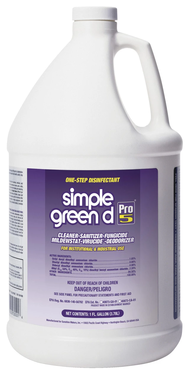 Simple Green D Pro 5 Disinfectant of 1 gal capacity is effective on hepatitis B and C, human coronavirus, canine distemper virus, MRSA, H1N1 flu, HIV-1 and influenza A. One step disinfectant and sanitizer featuring active ingredients is greatly used at kennels, cages, veterinary hospitals and more.