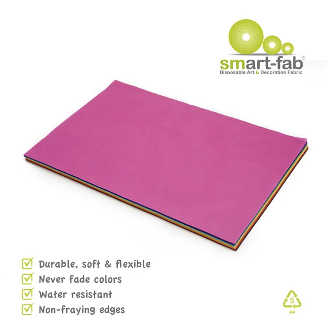 Smart-Fab Cut Sheet in assorted colors measuring 12 x 18 inches is the new alternative to paper/cloth, perfect for school and crafts projects. Smart-fab is the long-lasting, weatherproof innovative fabric that doesn’t fray and never fades. It’s fun to work with easy to cut, staple, sew, glue, paint on and shape into beautiful 3D forms. Sheets are easy to distribute and store. Cut sheet is sold as 45 per pack.