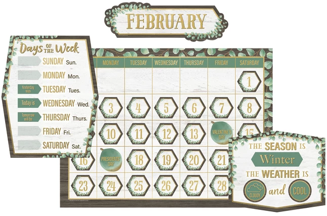 This wood and nature-inspired calendar display comes with easy-to-read number pieces, colorful monthly headers, and additional pieces for holidays and special occasions as well as pieces for yesterday, today, and tomorrow. Blank calendar measures 24″ x 18″. 91 total pieces.